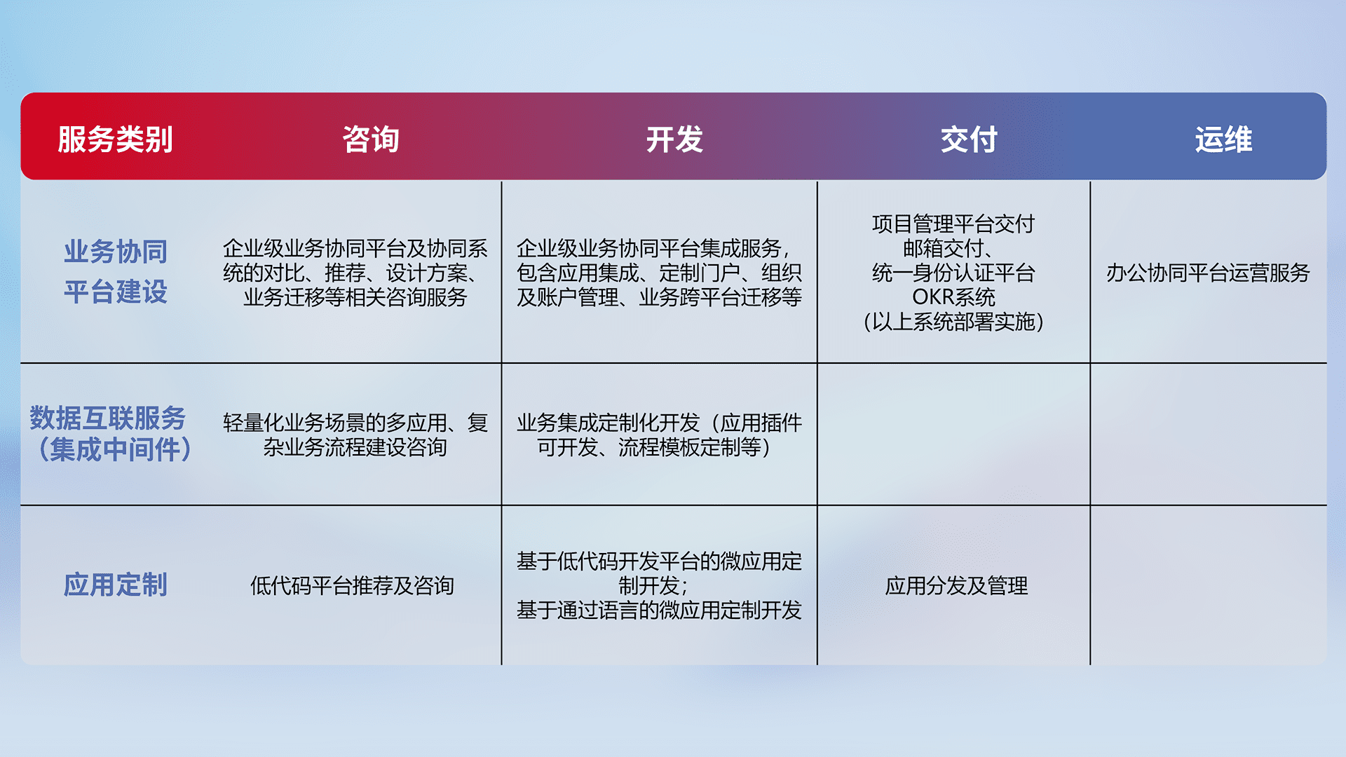 针对钉钉、、、企微、、、、IDaas等平台级产品提供产品的规划、、、、方案、、、、交付、、定制化开发等服务,,,实现如统一协同办公、、、、智能客户服务、、、、混合会议管理、、、智能数据查询、、、等业务场景,,实现数字化转型。。。。